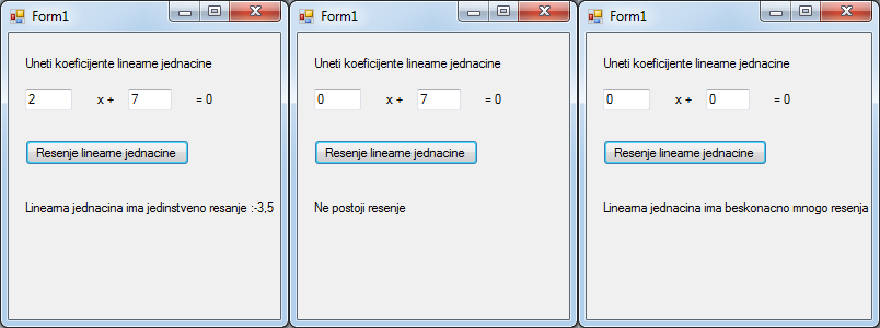 Пример 6. Написати програм који за унете коефицијенте линеарне једначине враћа њено решење.
