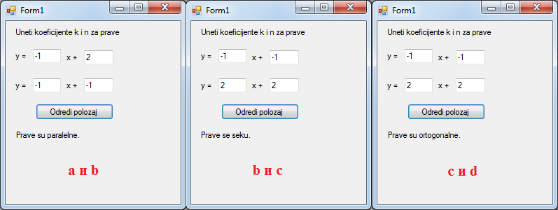 Пример 9. Написати програм који за унете коефицијенте враћа међусобни положај две праве у равни, ако су њихове једначине задате у експлицитном облику.