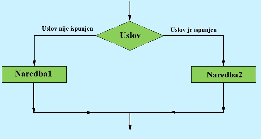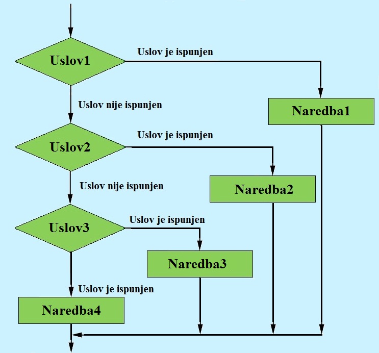 Ако је услов uslov1 true, извршава се блок naredba1. Ако је услов uslov2 true, онда се извршава блок naredbe2. Ако су и услов uslov1 и услов uslov2 false, онда се извршава блок naredbe3. |