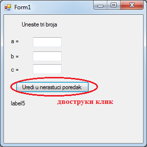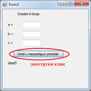 label5.Text = "Neopadajuci poredak brojeva je :" + a + ", " + b + ", " + c;