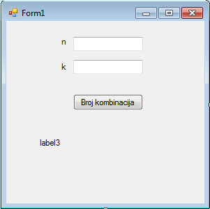 Двокликом на дугме Broj kombinacija отвара нам се прозор у коме пишемо код за наш програм. Унутар класе Form1 пишемо код за функцију факторијел, а унутар button1_Click пишемо код програма у коме ћемо више пута позивати функцију факторијел. | ||