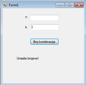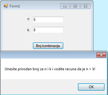 MessageBox.Show("Unesite prirodan broj za n i k i vodite racuna da je n > k!");