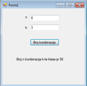 label3.Text = "Broj n kombinacija k-te klase je " + komb;