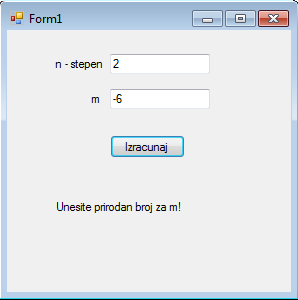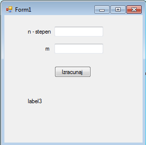 Двокликом на дугме Izracunaj отвара нам се прозор у коме пишемо код за наш програм. Унутар класе Form1 пишемо код за функцију степен, а унутар button1_Click пишемо код програма у коме ћемо позивати функцију степен. Како експонент може бити негативан, решења ће бити реални бројеви. | ||