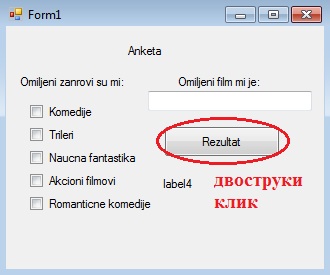 Пример 4. Написати програм који садржи пет checkBox-ова, један textBox и четири labele-е. Преко checkBox-ова бирамо жанрове филмова које волимо да гледамо, а у textBox уносимо омиљени филм. У одређену labele-у нам се исписује резултат свега сто смо одабрали.