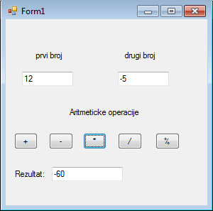 F5 отвара нам се форма и потребно је унети бројеве у TextBox и затим притиснути жељено дугме. Након тога ће се исписати резултат у TextBox, као на наредној слици, за произвољне унете бројеве и изабрано дугме (