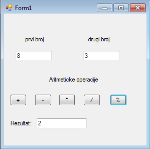 Пример 1. Написати програм који за два цела броја која корисник уноси преко TextBox-a примењује основне аритметичке операције (+, -, *, /, %), а резултат да исписује у ТextBox.