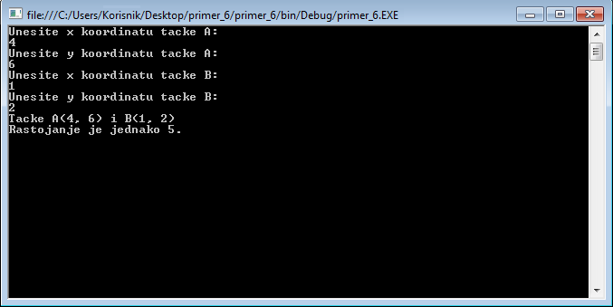 Пример 2. Направимо конзолну апликацију која ће да рачуна растојање између две тачке и резултат да испише у конзоли. Координате обе тачке корисник уноси преко конзоле, као на слици 5.18.