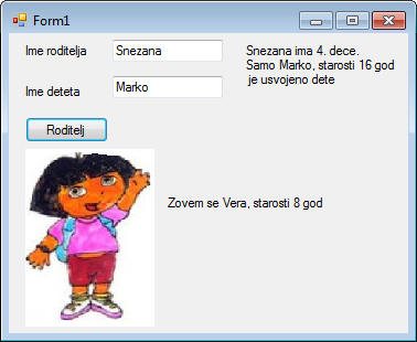 Правимо форму Form1(Слика 9.28.). Кликом на button1 у label3 се исписује оно што враћају функције toString() и Deca() класе Roditelj, док се у label4