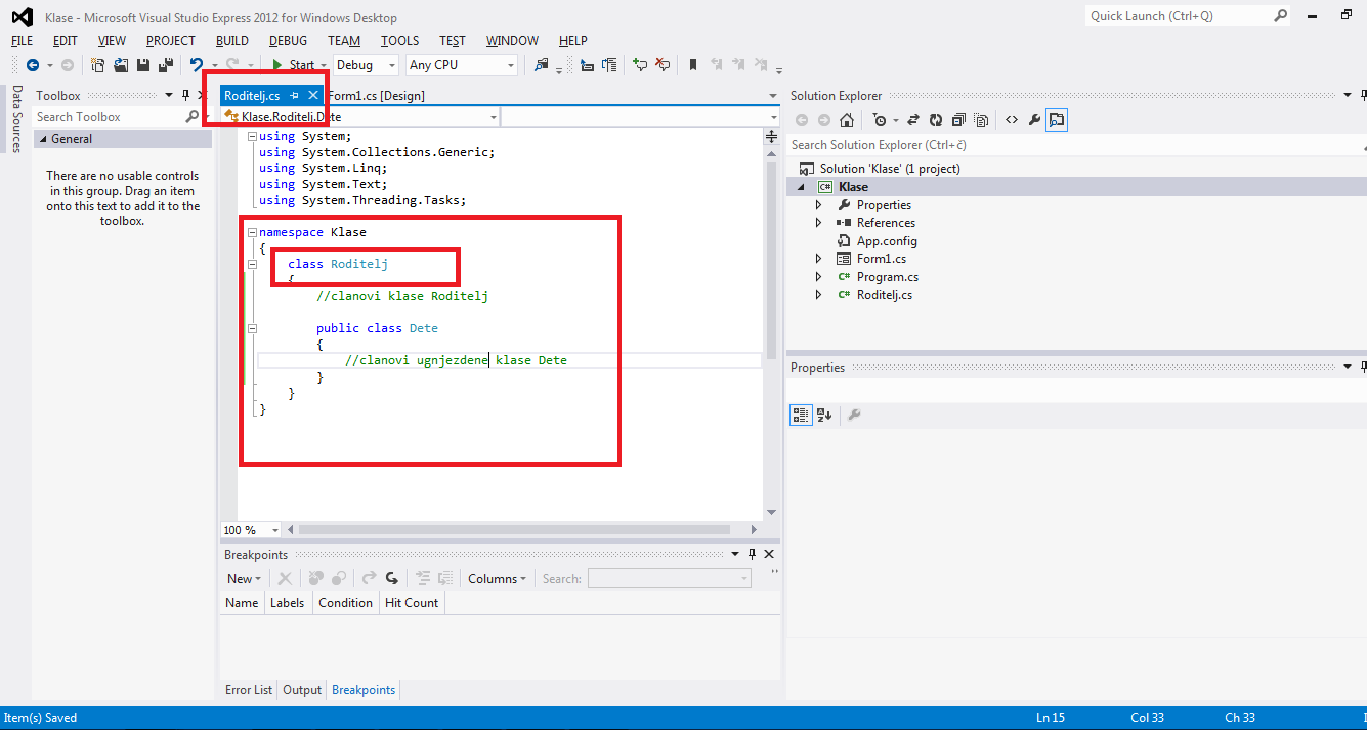 Приметили сте да смо у претходним примерима нове класе, класу Roditelj и њену угњеждену класу Dete, креирали унутар класе Form1, која нам служи за