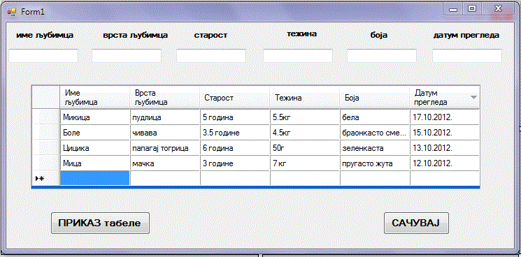 сачувај – пошто смо унели податке о љубимцу у текстуална поља, кликом на ово дугме они се сачувају у одговарајућим пољима табеле