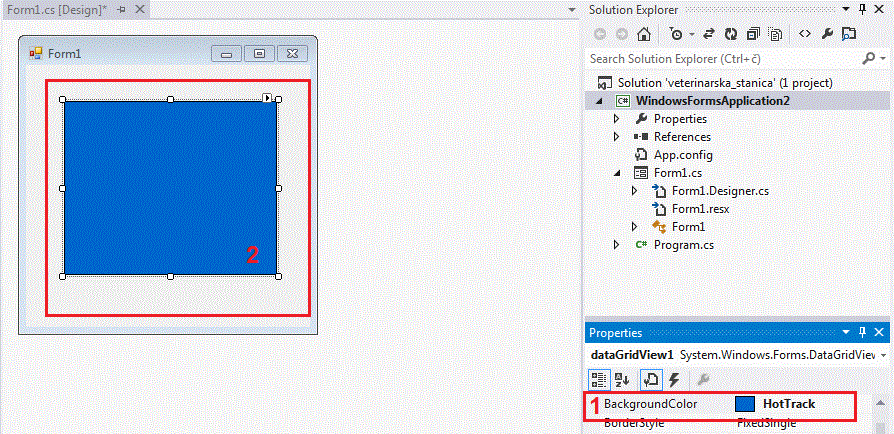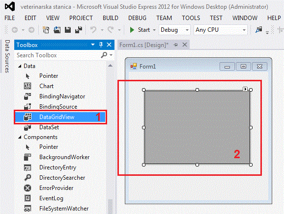 Отворимо нови пројекат, где нам се појави visual окружење, након што смо задали име пројекта. Двоструким кликом или превлачењем додамо DataGridView компоненту на Form-у.