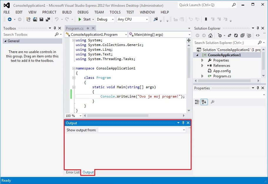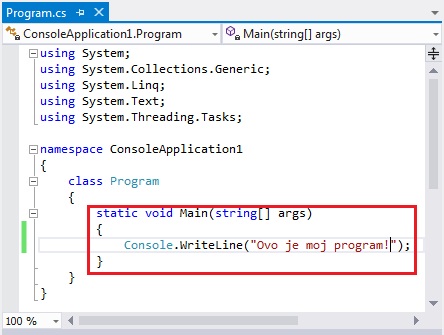 Наш циљ је да испишемо поруку Ово је мој програм! која ће се појавити у конзоли. Потребно је написати одговарајући код који ће омогућити исписивање ове поруке. Тај код се пише између заграда уоквиреног дела кода (Слика 3.3).