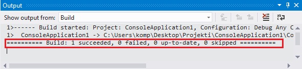 како би се у Output-у појавила порука о томе да ли постоје неке грешке. Уколико грешака нема порука у Output-у ће изгледати као на што је приказано на Слици 3.5 (ред који је уоквирен црвеном бојом говори о томе да у програму нема никаквих грешака). Након овога можемо да покренемо програм.