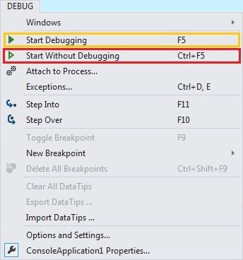 Програм се покреће тако што из Debug менија изаберемо опцију Start Debugging (Слика 3.6). Међутим, ако програм покренемо на овај начин, конзола ће се појавити само на кратко на екрану и одмах ће се затворити, тако да нећемо моћи лепо да видимо оно што је исписано у нашој конзоли. Због овога ћемо из Debug менија да изаберемо опцију Start Without Debugging (Слика 3.6). На овај начин ће се на екрану појавити конзола и остаће приказана на њему док је корисник не затвори (Слика 3.7).