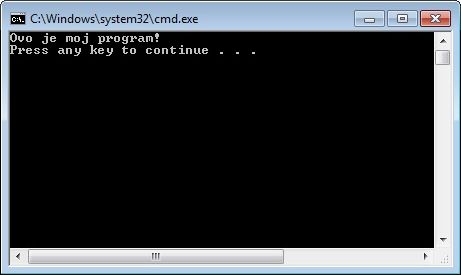 Видимо да је у првом реду исписана наша порука, а у другом реду је исписана порука Press any key to continue... која нас обавештава да уколико хоћемо да наставимо са извршавањем програма треба да притиснемо било који тастер на тастатури. У овом случају ако то урадимо наш програм ће се затворити.
