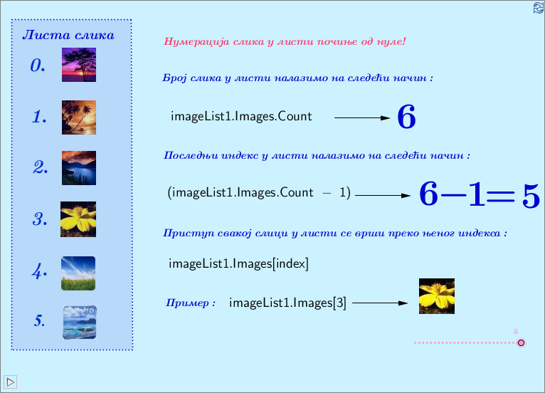 ImageList компонента се у Toolbox-y налази у категорији Components и представља колекцију слика исте величине. Све слике у листи су нумерисане односно свака слика има свој редни број који се још назива индекс. Нумерација слика у листи почине од нуле. Приступ свакој слици у листи се врши преко њеног индекса. Ова компонента се не види на форми, већ се види на дну DesignView-a (Слика 3.1).