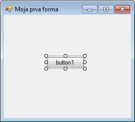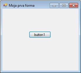 Када се компонента појави на форми, позиционирамо је на место које хоћемо, на пример на сам центар форме, тако да у нашем примеру форма изгледа као што је приказано на Слици 3.4. Дугме се зове button 1, али његово име можемо променити, тј дугме можемо преименовати у зависности од тога каква ће акција бити извршена када се кликне на њега, и можемо му променити изглед (на пример величину, боју и тако даље). |