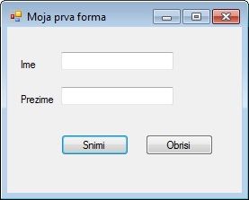 Притиском на неку компоненту жижа се помера на ту компонету. Жижа се може померати са једне компоненте на другу и тако што се притиска тастер Tab на тастатури, односно комбинација тастера Shift и Tab уколико желимо да жижу вратимо на претходну компоненту. Редослед померања жиже са компоненте на компоненту коришћењем Tab тастера, зависи од тога по ком редоследу смо додавали компоненте форми. Значи, ово је још једна ствар о којој треба да водимо рачуна приликом креирања апликације јер редослед померања жиже треба да следи логичан ток уношења података. Обично су компоненте распоређене тако да редослед померања жиже буде слева удесно и одозго надоле. На пример на Слици 3.7 редослед померања жиже теба да буде са првог поља за унос текст на друго поље за унос текста, па на дугме Snimi и на крају на дугме Obrisi, јер прво уносимо име па презиме и онда снимимо тај унос, а после тога бришемо тренутни унос како бисмо могли да унесемо нове податке (ово је логичи ток уношења података).