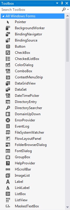 Timer (тајмер).Додавање компоненти се врши тако што се у Toolbox-у кликне на жељену компоненту, а затим се кликне било где на форму. Такође се додавање компоненте форми може извршити тако што два пута кликнемо жељену компоненту у Toolbox-у и компонента ће се одмах појавити на форми. Компоненту можемо померати по форми где хоћемо тако што кликнемо на њу и померимо је (држимо стиснути леви тастер на мишу све време док померамо компоненту по форми). Свака компонента се додаје на исти начин. На форми ће се налазити више различитих компоненти, а које ће то компоненте бити зависи од тога какву апликацију правимо.