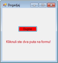 У једном пројекту ће се појављивати по неколико догађаја, па можемо да обрадимо још један догађај и у овом нашем примеру. На пример, када кликнемо два пута на форму, у лабели, коју смо додали форми, се испише порука Кликнули сте два пута на форму! и то црвеном бојом.