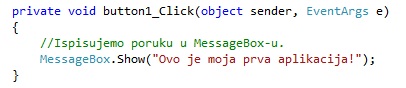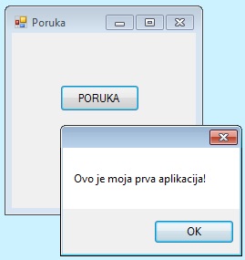 Пример 1. Написати програм који притиском на дугме PORUKA исписује поруку Ovo je moja prva aplikacija! у MessageBox-у.