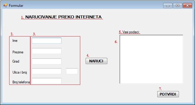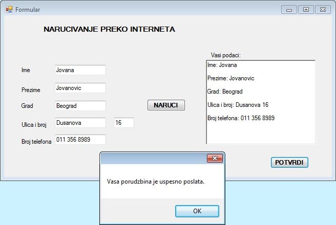 Пример 4. Написати програм који има шест TextBox компоненти у које ће са тастатуре да се уносe одређени подаци (име, презиме, град, улица и број, број телефона), кликом на дугме NARUCI се подаци исписују у richTextBox1, а кликом на дугме POTVRDI се појављује MessageBox са исписаном поруком: Vasa porudzbina je uspesno poslata.
