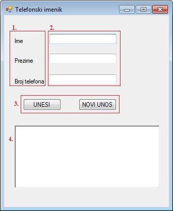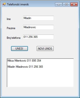Пример 5. Написати програм Телефонски именик. Омогућити унос имена, презимена и броја телефона (за свако посебно поље за унос текста). Кликом на дугме UNESI у RichTextBox се исписују подаци. Кликом на дугме NOVI UNOS поља за унос се празне, а у RichTextBox се исписује нови унос одмах после старог уноса (значи претходни унос остаје исписан).