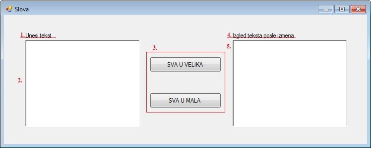 Након овога следи писање кода. Два пута кликнемо на дугме SVA U VELIKA и напишемо одговарајући код за то дугме, а затим два пута кликнемо на дугме SVA U MALA и напишемо одговарајући код за то дугме.