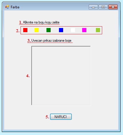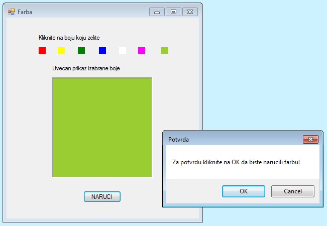 Пример 7. Написати програм који има приказаних 7 боја на које кад се кликне у новом PictureBox-у се појављује увећан приказ те боје. Кликом на дугме NARUCI исписује се порука За потврду кликните на OK да бисте наручили фарбу! у MessageBox-у (MessageBox треба да има два дугмета ОК и Cancel).