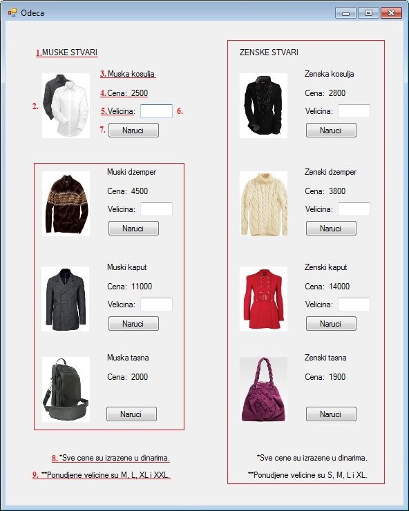 Пример 9. Написати програм који приказује неколико слика мушке и женске гардеробе, а поред сваке слике се налазе подаци везани за ту слику (назив артикла и цена). Такође се поред сваке слике налази поље у које се уноси величина артикла и дугме Naruci. Кликом на дугме Naruci се у MessageBox-у исписује порука шта је наручено и која је величина наручена.