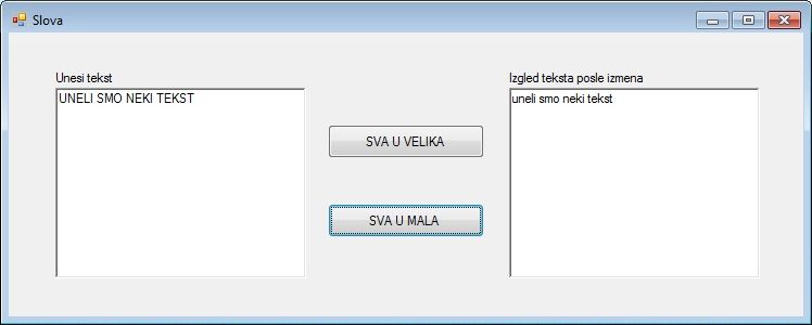 Пример 6. Написати програм који кликом на дугме SVA U VELIKA претвара сва слова текста исписаног у richTextBox1 у велика и исписује их у richTextBox2, а кликом на дугме SVA U MALA претвара сва слова у мала и исписује их у richTextBox2 (у првом RichTextBox-у остаје оригиналан текст, а у другом се исписује у измењеном облику).