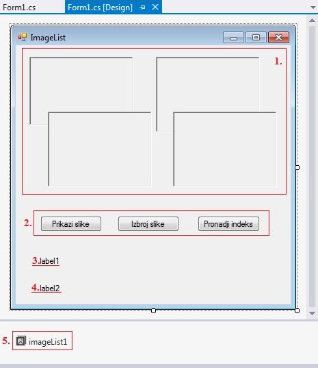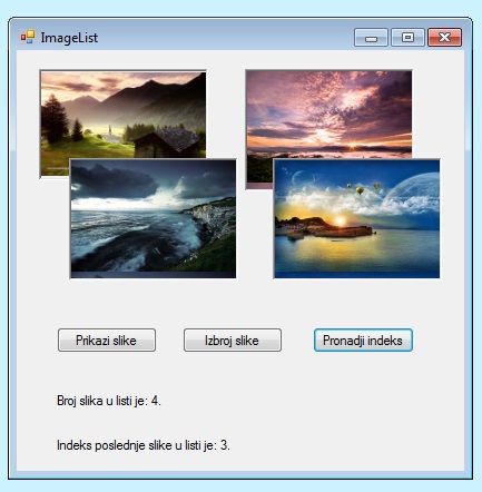 Пример 8. Написати програм који кликом на дугме Prikazi slike убацује слике из ImageList компоненте у PictureBox компоненте, кликом на дугме Izbroj slike исписује у лабелу број слика из ImageList компоненте, а кликом на дугме Pronadji indeks исписује у другу лабелу индекс последње слике у листи.