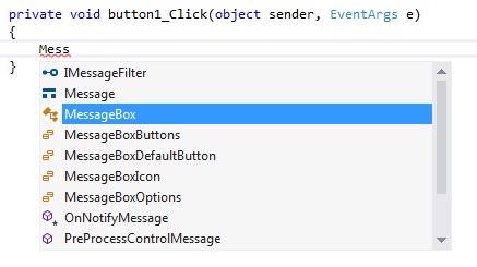 Овај први пример ћемо детаљније објаснити. Прво форми треба да додамо компоненту дугме. Након тога у Properties Windows-у треба да променимо својство Text компоненте Button тако да на њему буде исписано PORUKA. Пошто жeлимо да се MessageBox са исписаном поруком појави када кликнемо на дугме PORUKA, онда прво кликнемо два пута на дугме да би му придружили догађај Click. Одмах ће се отворити део кода и курсор ће бити постављен на место на коме треба да куцамо потребан код помоћу кога ће се извршити оно што се тражи у задатку. Напишемо ли неколико почетних слова појавиће нам се листа у којој селектујемо MessageBox (Слика 3.1).