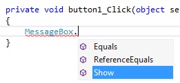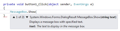 После овог се ставља тачка и опет ће се појавити листа са понуђеним методама (Слика 3.2). Ми ћемо изабрати Show методу. Ова метода може да има више аргумената у заградама, или само један, тако да сада отворимо заграду и појавиће се уоквирено објашњење које описује који то све аргументи могу бити и како се они пишу. На почетку се налазе мале стрелице на које када се кликне приказују се различити аргументи MessageBox-а (Слика 3.3).