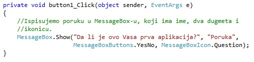 Пример 2. Написати програм који притиском на дугме PORUKA исписује питање Da li je ovo Vasa prva aplikacija? у MessageBox-у. MessageBox треба да има два дугмета Yes и No, име и иконицу.