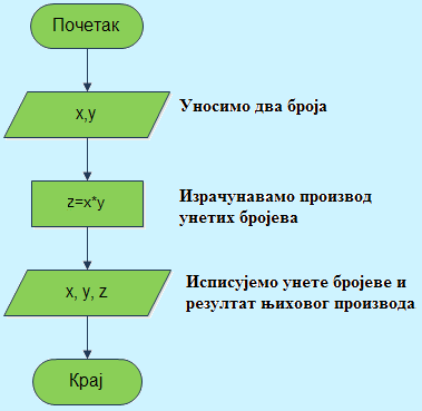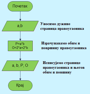 Пример 11. Дате су дужине страница правоугаоника а и b. Дијаграмом опишите алгоритам за рачунање површине и обима правоугаоника датих страница, а онда испишите дужину страница, површину и обим правоугаоника.
