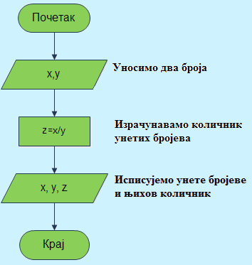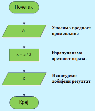Пример 9. Опишите алгоритам (дијаграмом) за израчунавање израза х = а / 3, а је дат произвољан број.