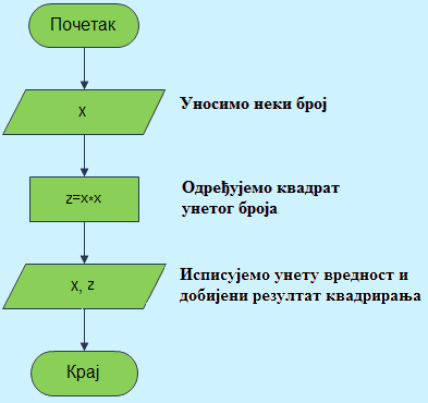 Пример 8. Опишите дијаграмом алгоритам за разлику, производ и количник два произвољна дата броја, а потом и квадрат задатог произвољног броја.