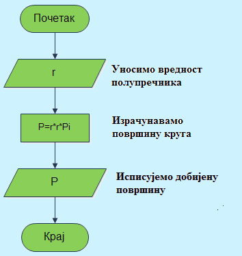 Пример 10. За дати полупречник напишите алгоритам за израчунавање површине круга.