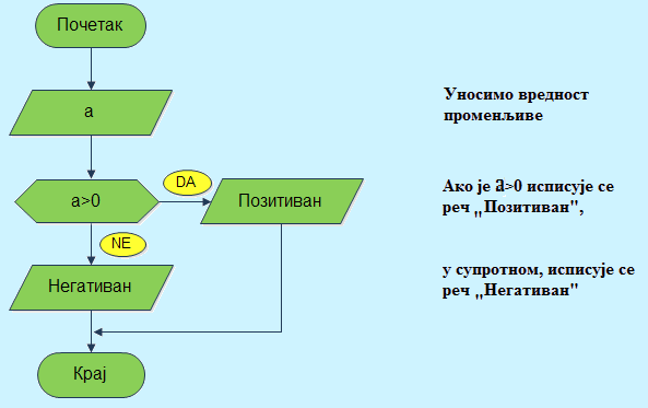 Пример 12. Дат је произвољан број различит од нуле. Напишимо алгоритам који исписује да ли је број позитиван или негативан.