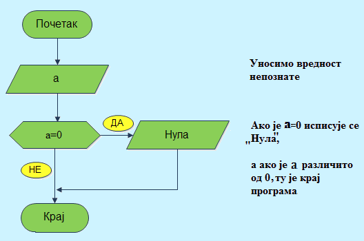 Пример 13. Дат је произвољан број. Напишите алгоритам који проверава да ли је број једнак нули и исписује ,,Нула" ако јесте.