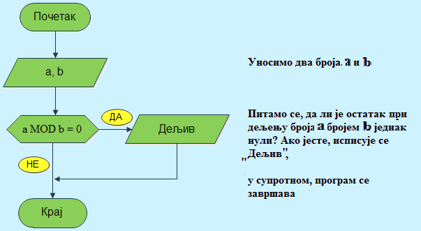 Пример 14. Напишите алгоритам који проверава да ли је од два дата броја први дељив другим, а потом исписује ,,Дељив" ако јесте.