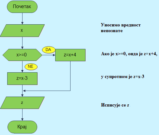 Пример 16. Дат је произвољан број х. Напишите алгоритам који исписује број за 3 мањи од х, ако је х негативан број, а у противном исписује број који је за 4 већи од х.
