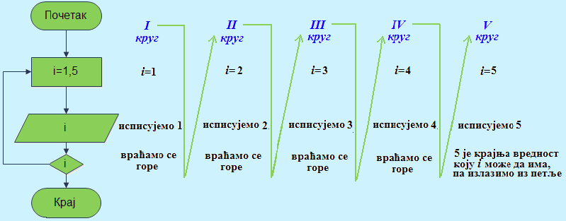 Пример 17. Написати алгоритам који исписује редом све природне бројеве од 1 до 5.