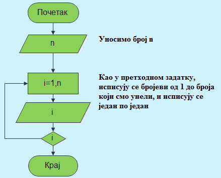 Пример 18. Напишите алгоритам који за произвољно n које се задаје исписује првих n природних бројева.