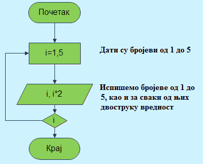 Пример 19. Напишите алгоритам који исписује редом првих пет природних бројева заједно са њиховом двоструком вредношћу.