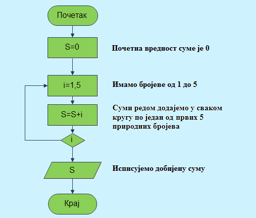 Пример 20. Опишите дијаграмом алгоритам који исписује суму првих пет природних бројева.