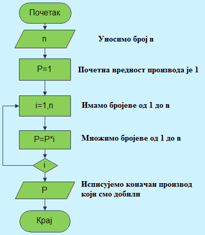 Пример 21. Описите дијаграмом алгоритам који исписује производ првих n природних бројева. Број n је задат и произвољан природни број.