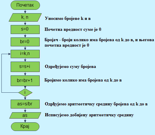 Пример 22. Дата су два природна броја, мањи к и већи n. Напишите алгоритам за исписивање аритметичке средине бројева од к до n укључујући и те бројеве.